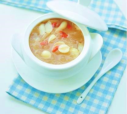 【烹饪步骤】①准备银耳,莲子,百合,枸杞,红枣,冰糖。②将莲子、银耳用温水泡软;干百合用温水泡发;枸杞、红枣用凉水洗净,备用。③锅中倒入清水,将切好的银耳、去芯莲子、红枣一起放入锅中,大火煮沸改小火煮约30min。④加入枸杞、冰糖,中火再炖10min即可。